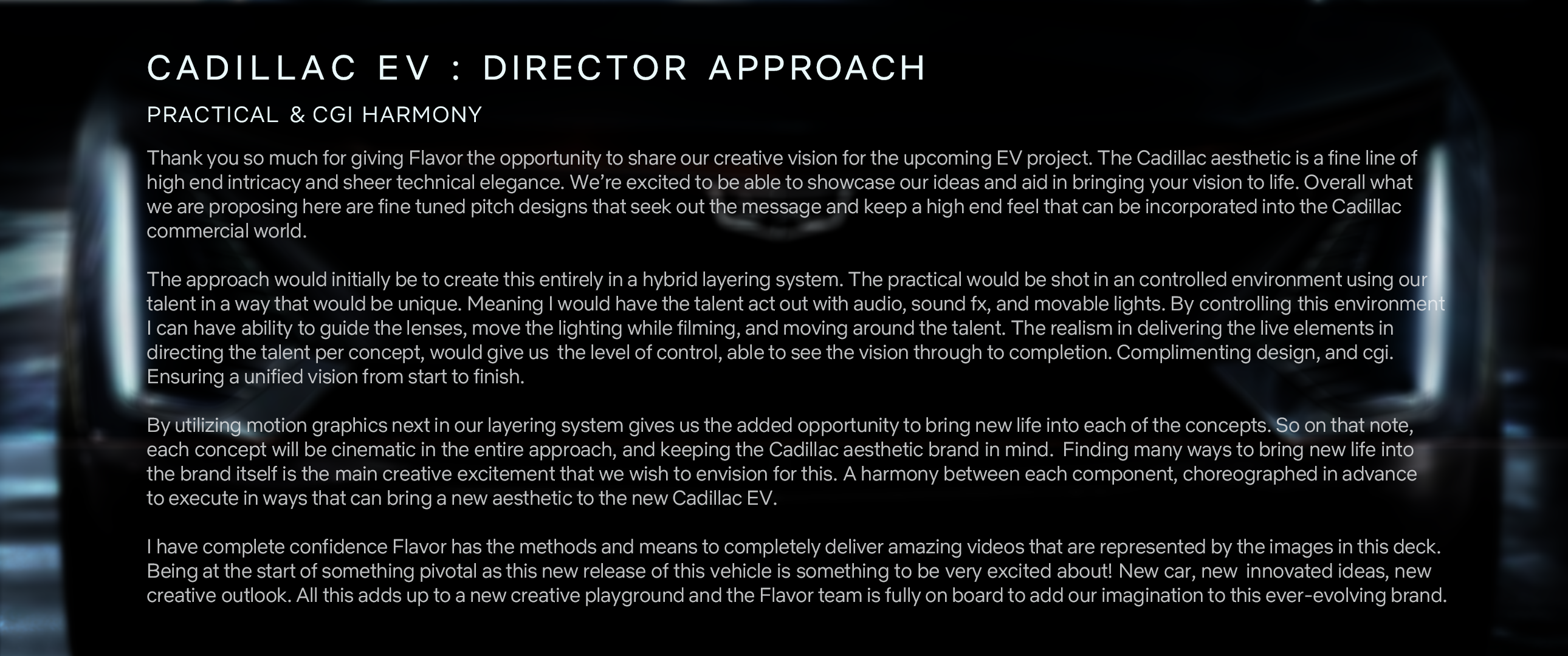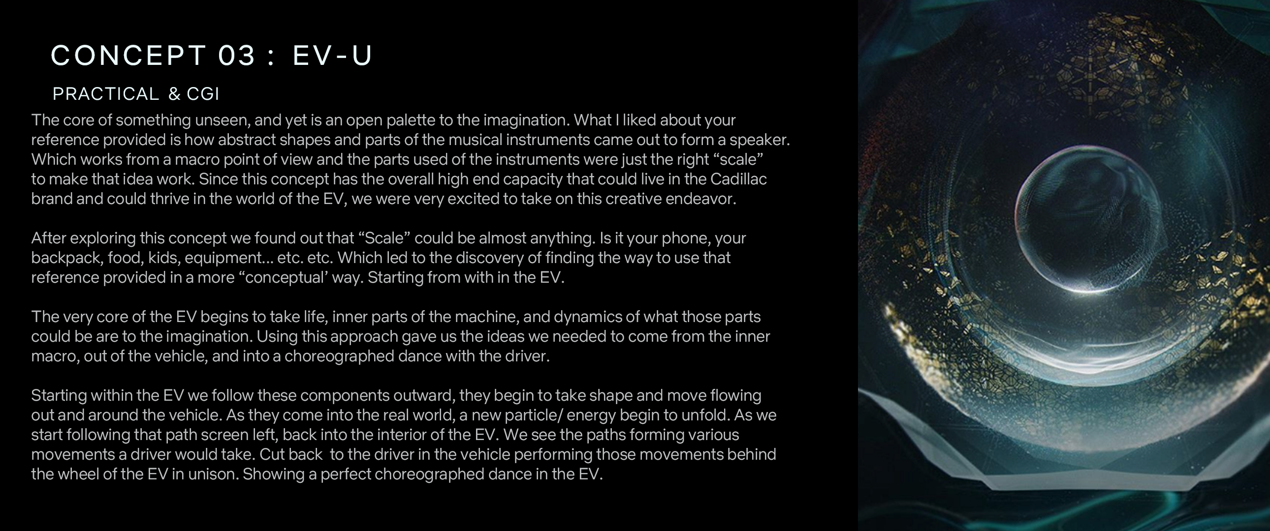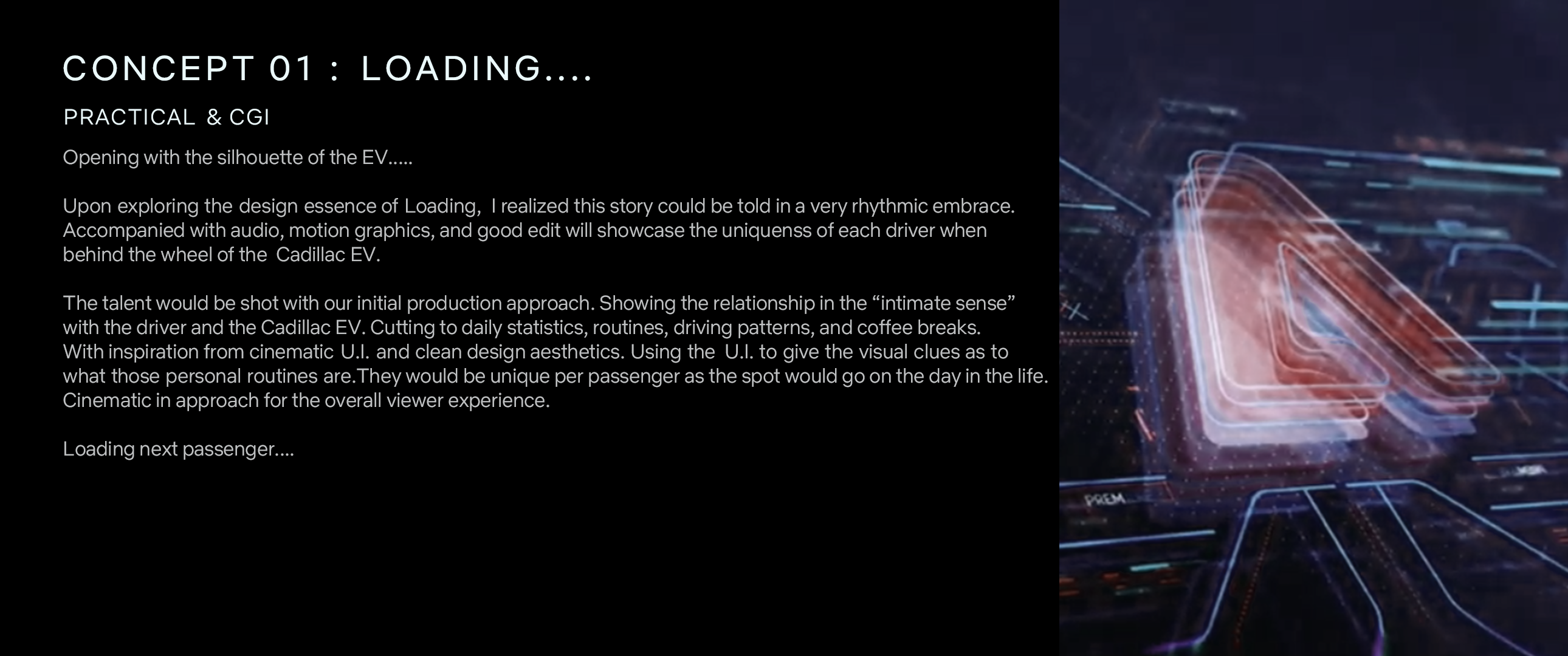 Initial Director's treatment in 2019, which was the early preliminary phases of the Cadillac EV video concepts. Ideated after early scripts entitled Intuitively Yours, to which the product was yet to be launched, and still in various dev phases. The Direction and UI development ended up with a "Pencil's Down". As it gave the team from Cadillac new ways to consider their display UI design in the EV, and how to think about this new technology.